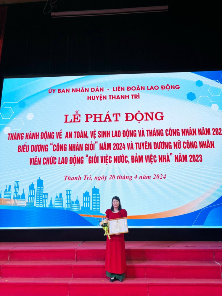 Cô giáo Nguyễn Thu Hương - giáo viên Tiếng Anh trường Tiểu học B Thị Trấn Văn Điển vinh dự đạt danh hiệu trong phong trào thi đua "Giỏi việc nước, đảm việc nhà" huyện Thanh Trì năm 2023.
