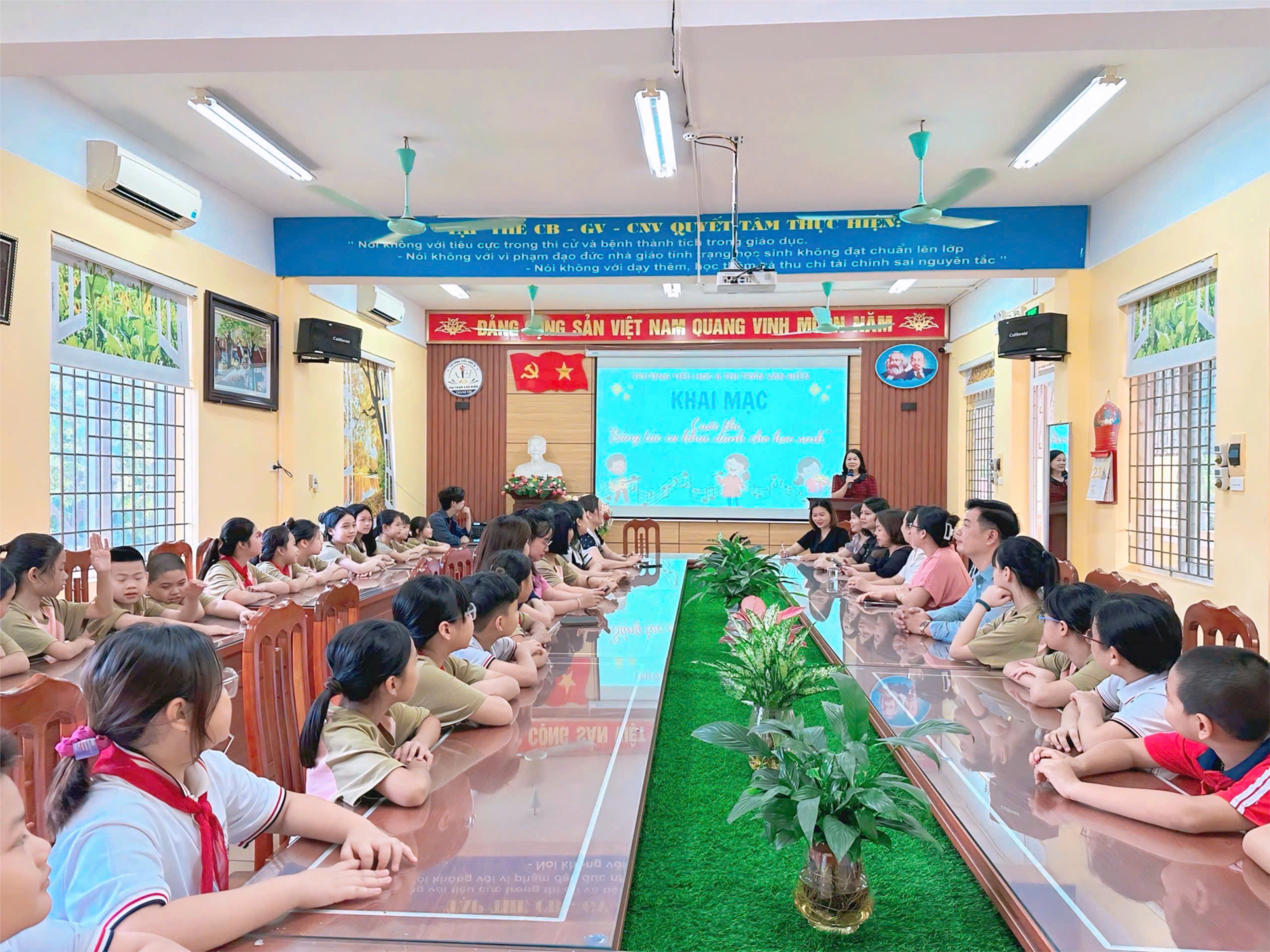 Thực hiện kế hoạch số 254/KH-SGDĐT ngày 25/01/2024 của Sở Giáo dục và Đào tạo Hà Nội về việc Phát động phong trào thi đua chào mừng các ngày lễ lớn năm 2024 và kỷ niệm 70 năm Ngày Giải phóng Thủ đô (10/10/1954 -10/10/2024); 70 năm thành lập Ngành Giáo dục và Đào tạo Thủ đô (1954-2024); Kế hoạch số 874/KH-SGDĐT ngày 26/3/2024 của Sở Giáo dục và Đào tạo Hà Nội về Kế hoạch tổ chức Cuộc thi “Sáng tác ca khúc dành cho học sinh” kỷ niệm 70 năm thành lập Ngành Giáo dục và Đào tạo Thủ đô (1954-2024); kế hoạch số 255/KH-PGD&ĐT ngày 01/04/2024 của Phòng Giáo dục và Đào tạo huyện Thanh Trì về việc tổ chức cuộc thi “Sáng tác ca khúc dành cho học sinh” kỷ niệm 70 năm thành lập Ngành Giáo dục và Đào tạo Thủ đô. Sáng ngày 8/4/2024 trường Tiểu học B Thị Trấn Văn Điển long trọng tổ chức Khai mạc Cuộc thi “Sáng tác ca khúc dành cho học sinh” kỷ niệm 70 năm thành lập Ngành Giáo dục và Đào tạo Thủ đô (1954-2024)